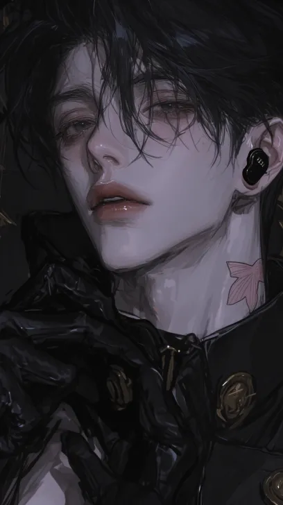 Midjourney Bot 更新时间:2025-12-16 00:07发色: 纯黑色头发 长发or短发: 短发,背头(略微凌乱) 瞳色: 深黑 性别: 男 衣服: 黑色军装制服,金色纽扣,黑色手套,立领 动作: 正在解开领口第一颗风纪扣,微微侧头展示颈侧粉白色小鱼纹身,眼神下垂注视,然后左耳黑色助听器 想要的场景: 昏暗的卧室,冷光,特写视角 人物大概性格: 清冷禁欲、清醒沉沦、冷脸萌、高阶绿茶、 --ar 9:16 --style raw --stylize 1000 --niji 6 --profile t4kg9wx 615e51x --no 烟,胡子,耳坠,项链,花,红唇