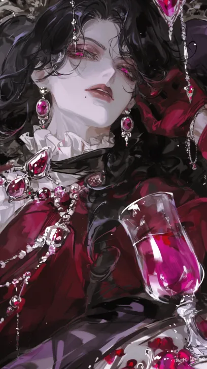 Midjourney Bot 更新时间:2025-12-16 00:08黑色长卷发,女人,紫红色眼睛,紫红色宝石项链,紫红色宝石耳坠,嘴边痣,手指上有紫红色玫瑰的戒指,三七分刘海,动态头发,暗红色礼裙,暗红色镶金边手套,手里拿着一杯紫红色葡萄酒,坐在一个镶满紫红色的晶石的王座上,王座旁边一堆紫红色的葡萄,背景是紫红色星空和处女座的星座标志 --ar 9:16 --style raw --stylize 400 --niji 6 --profile spr1pcg
