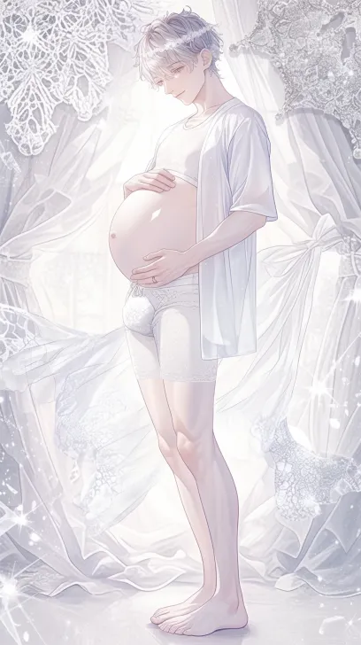 Midjourney Bot 更新时间:2025-12-16 00:08彩色线条画,不透明水彩,高品质,高画质,详细细节,日本漫画风,白色基调,白色圣诞节,一个俊美动漫男人,怀孕,梨形身材,冷白皮,腹肌可见,双腿细长,白蕾丝,闪闪发光的钻石灰尘,幻想背景 --ar 9:16 --style raw --stylize 180 --niji 6 --no no