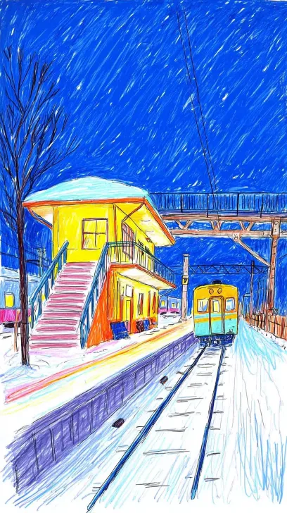Midjourney Bot 更新时间:2025-12-16 00:10https://images.gogpt.vip/aigf/m_origin/20251216/1778482/s2flm3uym1nq4cpp.jpg 治愈系彩铅手绘插画,雪夜车站场景覆雪的黄色候车亭旁,暖光列车驶入,天桥横跨铁轨,旁立枯树与栅栏;天空是深蓝底 + 飘雪,笔触带彩铅粗粝肌理,色调以深蓝、暖黄、银白为主,光线温暖朦胧,氛围静谧又治愈,兼具车站烟火与手绘温馨感。 --ar 9:16 --v 7 --stylize 1000 --sref https://images.gogpt.vip/aigf/m_origin/20251216/1778482/s2flm3uym1nq4cpp.jpg --sw 1000