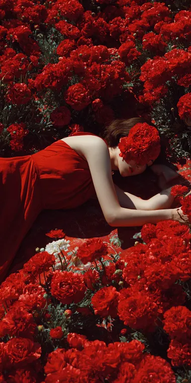 Midjourney Bot 更新时间:2025-12-16 00:12俯视视角,光线较明亮 躺在白色波斯菊花海(花海把茎挡住,不要有太多绿色)中的身着红色连衣裙的女人,不过女人的头部用一个红色的稍大一点的波斯菊替代,女人动作慵懒,平躺在花海中,皮肤颜色偏白,发色为黑色, --ar 1:2 --v 7 --stylize 100 --no 叶子,与面部相关的所有