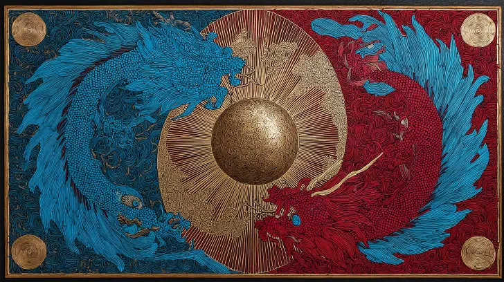 Midjourney Bot 更新时间:2025-12-16 00:08Based on the Tai Chi diagram, the blue and red zones depict blue and red dragons respectively. The Tai Chi eye is a golden sphere, paired with a deep base and golden lines. It is a magnificent Chinese style work that combines elements of yin and yang and dragon, combining Eastern philosophy with exquisite texture. --ar 16:9 --v 7 --stylize 100