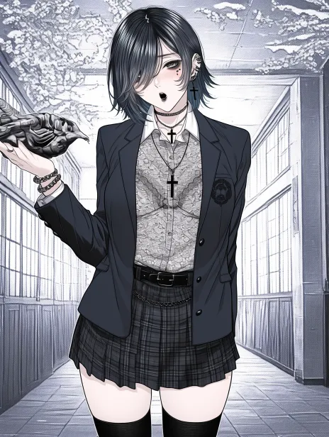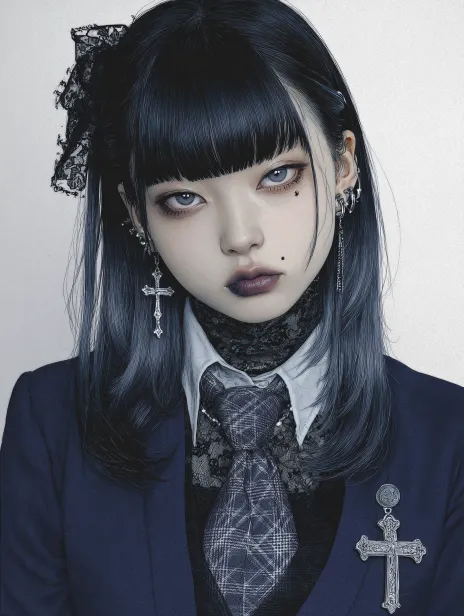 Midjourney Bot 更新时间:2025-12-16 00:09https://images.gogpt.vip/aigf/m_origin/20251216/1986305/o3hq5gnxfbhi76l2.png Appearance: 16-year-old Japanese girl, delicate small V-shaped face, skin color cool white like porcelain. Rare silver-gray narrow Danfeng eyes, gaze distant and weary, with a prominent vermilion tear mole under the left eye. Ink blue waist-length hair, with the ends dyed misty silver-gray for 15 cm, left side bangs secured with a gothic cross hairpin. Naturally dark lips, corners of the mouth slightly drooping. Clothing: Altered private school deep blue blazer (taken in one size, outlining curves), layered with a semi-transparent black lace turtleneck. The school uniform plaid skirt shortened to above the thighs, with black lace trimming sewn at the hem. A thin leather belt tied around the waist, hanging a small cross. Legs are clad in black sheer over-the-knee stockings, with gothic patterns embroidered at the cuffs. Accessories: Wearing a pure silver cross long necklace (approximately 14 cm) with a thin short silver chain. Multiple thin silver bracelets on the left wrist (cross, skull, musical note pendants). Three ear piercings on the left ear (chain ear cuff, cross dangling earring, black stud), silver stud on the right ear. Feet adorned with matte black lace-up Martin boots. Environment: Japanese classical campus at dusk, such as a quiet old school corridor or a cherry blossom avenue. Cool-toned lighting creates a sense of loneliness and fragmentation. Style: Dark gothic mixed with Japanese academy style, highlighting a mysterious, melancholic, fragmented, and dangerous aura. Emphasizes cold aloofness and inadvertently revealed fragility. Image quality instructions: Highest image quality, ultra-fine details, complex fabric textures (lace, leather, metal), cinematic dramatic lighting and shadows, shallow depth of field effect. Negative prompts: Avoid excessive sexualization, maintain a gloomy cold feel, no smiles, no cute styles, avoid bright colors, background should not have modern elements, no mechanical armor, avoid direct, passionate eye contact. Additional details: add subtle blush on pale cheeks (from cold or emotion), slight pout, avoiding direct eye contact, gazing slightly away with a distant, tired expression. --ar 3:4 --v 7 --stylize 100 --iw 0.25 --no Overly sensual,modern elements,bright colors,cute style,mechanical armor.