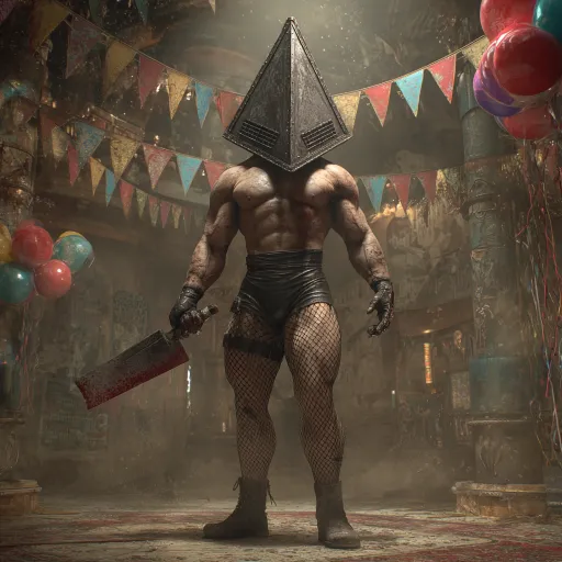 Midjourney Bot 更新时间:2025-12-16 00:09https://images.gogpt.vip/aigf/m_origin/20251216/1987443/qqgzcdzd2h0rqbhe.png Silent Hill Pyramid Head, male muscular body, wearing a black bodysuit and fishnet stockings, holding a large plastic toy knife in one hand. The background is an abandoned theater in an amusement park, with some colorful streamers and worn-out balloons. Pixar animation style, soft lighting. --ar 1:1 --v 7 --style raw --stylize 100 --iw 0.25 --no anime,cute,feminine,soft lighting,clean
