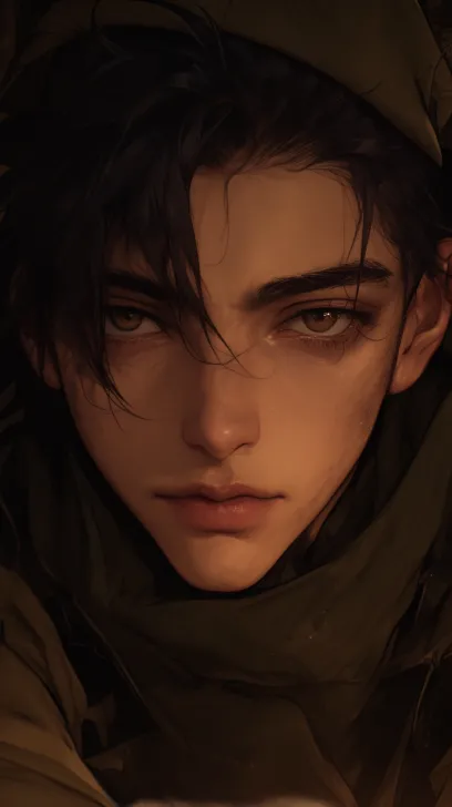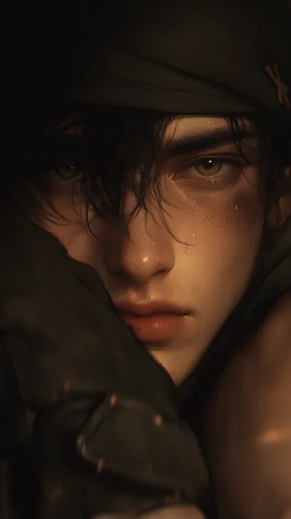 Midjourney Bot 更新时间:2025-12-15 00:04Thick brushstroke style (rough brush, gritty textured colors, 3D contour lines), fisheye distortion, bird's-eye view perspective, mid-range composition. A man (with deep-set features, sun-kissed dark wheat-colored skin, gray-purple short hair slightly curled by a military cap, and eyes of sedimented dark gold) is wearing a heavily worn sand-colored beret tilted to one side, the brim's shadow covering half of his brow bone. He is dressed in an olive green old military shirt with the collar undone, sleeves rolled up to the elbows, revealing forearms covered in various scars and well-defined muscles. He leans against the hood of a jeep riddled with bullet holes, hands resting backward on the scorching metal, body slightly reclined. The sweat-drenched shirt clings to his chest. He slightly lifts his chin, his dark golden eyes piercing through the searing distorted air and swirling dust like a desert viper fixated on prey, firmly locking onto the camera lens of a war correspondent ahead, a smirk curling at the corner of his mouth that carries the scent of gunpowder, a cheeky yet dangerously rebellious grin. The background features blurred silhouettes of burning ruins and dead trees. Facial details in 32k quality, thick paint style in anime illustration, handsome guy, non-realistic. --ar 9:16 --stylize 724 --niji 6 --profile 2twrvmr ys8rdej 5dvd9ey
