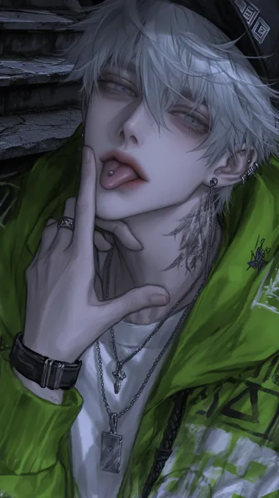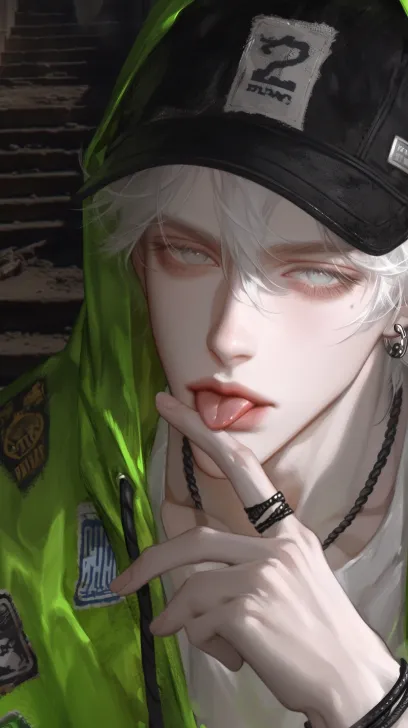 Midjourney Bot 更新时间:2025-12-15 00:07一个极其英俊的22岁动漫男人,从上往下拍,面部特写,英俊,帅气,阴郁,长睫毛,浅色虹膜,手上戴着黑色皮绳手链,白色短发,黑色鸭舌帽,吐舌头,手摸下唇,内穿白色t恤,戴简单的项链,外穿荧光绿连帽衫,衣服上有时尚的贴布,背景楼梯,废墟,清透,大胆的构图。精致的五官,老电影滤镜,8k壁纸,大师之作。 --ar 9:16 --c 2 --stylize 875 --niji 6 --profile r6ra4rs c22a1ma l1inms4 kxzxhy6 --no 露牙齿