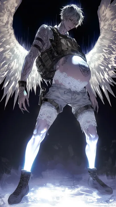 Midjourney Bot 更新时间:2025-12-15 00:10一个俊美动漫男人,怀孕,清晰8K,冷白皮,腹肌可见,双腿细长,发光,夜晚,身上胸前和腿上都有纹身,白色蕾丝harness,防弹背心,臂章,黑白线画,后仰,站着,翅膀,正面视角 --ar 9:16 --style raw --stylize 180 --niji 6 --no no