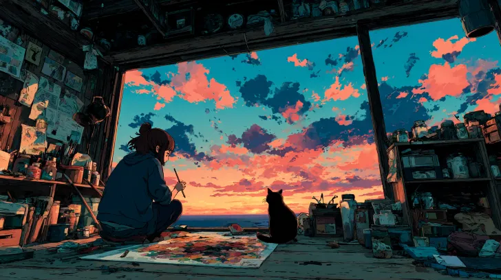 Midjourney Bot 更新时间:2025-12-15 00:14绘本封面插画,黄昏的魔幻时刻,温柔孤独与希望并存的情感氛围 主角:年轻内向的女裁缝露娜,23岁,苍白肤色,纤细手上有针线茧,穿着亚麻围裙和棉质长裙。她坐在工作室里,身体语言略微蜷缩但手指灵巧。台灯光线如舞台光般聚焦在她身上,她是画面中唯一清晰的脸。 关键视觉隐喻:一扇巨大玻璃窗将画面分为两个世界。窗内:安全、有序、安静的工作空间,光线可控。窗外:生动、温暖、充满生活气息的小镇傍晚。猫蹲在窗台上,连接内外世界。 色彩设计:室内主色调为暖黄/木褐/深蓝;窗外为紫蓝黄昏天空与建筑暖黄灯光对比;天空顶部为深蓝色用于书名。光线:台灯(点光源)与黄昏天光(面光源)的交织。 艺术风格:柔和的水彩渲染,清晰的线条勾勒,轻微的光晕效果,童话现实主义。细节层次:近景露娜与工作台高度详细,中景窗框与猫中等细节,远景小镇建筑略微模糊。构图采用三分法则,玻璃窗在左侧黄金分割线。 技术参数:比例2:3,细腻纹理,柔和阴影,温暖色调,情感叙事性插画,大师级绘本艺术,无边框 一位23岁的年轻女裁缝,坐在木工作台前,侧脸被台灯光照亮。戴银框眼镜,深棕色长辫子,穿亚麻围裙和棉长裙。手持针线正在缝纫,膝上铺着深蓝色带星纹刺绣的布料。面容清秀,表情专注内向,手指纤细有茧。身体语言略微蜷缩但优雅。 室内场景:复古裁缝工作室,木制工作台,老式台灯(唯一强光源),散落的线轴、剪刀、布料样品。墙面上挂着部分完成的衣物作品。木制书架上有古老书籍和玻璃瓶。整体色调温暖(黄褐、深蓝、暗红),光线柔和聚焦。 巨大的落地玻璃窗占据画面左侧三分之一。窗框是深色木材,玻璃清澈但有轻微反光。窗户将画面明确分割为室内外两个空间。 室外场景:黄昏时分的欧洲风格小镇(波光镇):鹅卵石街道,传统石木建筑,倾斜屋顶,烟囱。远处窗户透出暖黄色灯光,炊烟袅袅。天空是紫蓝色渐变到地平线的橙红色。氛围宁静生动。 连接元素层:一只橘白相间的猫蹲在窗台外侧,前爪并拢,尾巴卷曲,正透过玻璃好奇地看着室内的裁缝。猫的位置正好在室内外交界处。 画面顶部约1/5为深蓝色夜空,有几颗微小的星星。这部分区域干净简洁。 --ar 16:9 --v 7 --c 40 --stylize 700 --no 不要魔法光效,不要奇幻元素,不要夸张表情,不要现代家具,不要杂乱背景,不要阴暗色调,不要模糊焦点,不要多人场景,不要文字覆盖画面,不要照片写实,不要暗黑风格,不要抽象艺术,不要卡通简化,不要战斗场景,不要科幻