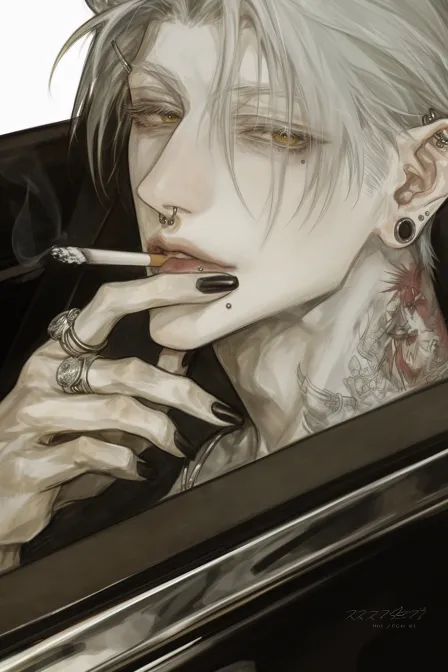 Midjourney Bot 更新时间:2025-12-15 00:14一个正在抽烟的男人,豪车,左耳银耳夹,唇下痣,有着黄棕色瞳孔,白色三七分发型,纹身,脖子有一颗红痣,唇钉耳钉,黑指甲,嘴角勾起一抹坏笑,手指青筋暴起,大佬气质,掌控者,一种高高在上的感觉,夜晚 --ar 2:3 --style raw --stylize 470 --niji 6 --profile spr1pcg cjgdoqp --no 纹身
