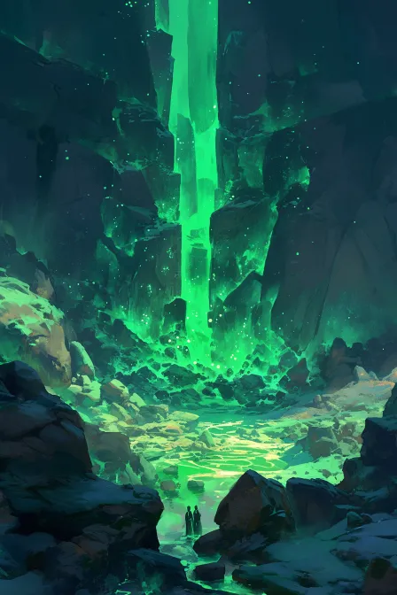 Midjourney Bot 更新时间:2025-12-15 00:04In the depths of night, a faint green light emanated from the mysterious cave, illuminating the surrounding rocks in shades of green. --ar 2:3 --stylize 100 --niji 6