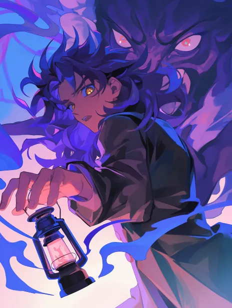 Midjourney Bot 更新时间:2025-12-15 00:04Two-dimensional, colors clear and low saturation, a young man with long blue-purple hair, a young man in a long black trench coat, golden pupils, half-body front view looking down, one hand reaching forward, large perspective, eyes have a sense of oppression, hand pressing down on a very small purple monster in the foreground, background has a vintage lantern with blue flames. --ar 3:4 --stylize 100 --niji 6