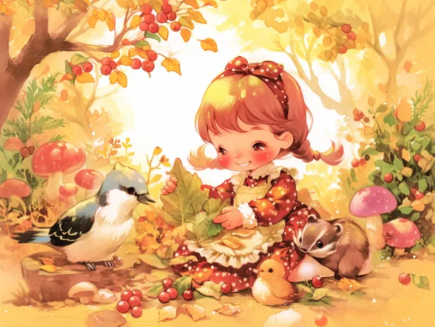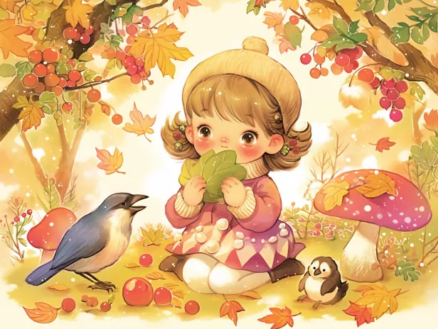 Midjourney Bot 更新时间:2025-12-15 00:08The scene adopts a center-symmetric composition, with a smiling and clear-eyed little girl kneeling in a clearing filled with fallen leaves in the autumn. She leans slightly forward, carefully holding a large sycamore leaf with both hands—her fingertips gently supporting the leaf's stem, while the curve of her thumb and index finger is delicate yet stable, as if showcasing a precious piece of natural art. Her eyes are curved with pure joy, sparkling with bright light, her cheeks flushed with excitement, and her mouth opens into an unreserved and radiant smile, revealing her white teeth. Next to her, on a pile of fallen leaves, a small badger with spotted patterns on its back is raising its nose, curiously sniffing the edge of the leaf; and behind her left shoulder, a blue-gray jay quietly perches on a low-hanging maple branch, tilting its head, its bright gaze meeting that of the girl. The background features a warm-toned autumn forest, with intertwining golden-red canopies and drooping berry bushes naturally gathering behind the girl, creating a tranquil and bountiful picture. The afternoon sunlight filters through the branches and leaves, casting dappled light onto her and the animals' fluffy fur and feathers, filling the entire scene with the innocent discoveries of childhood and the serene yet lively encounters of the autumn woodland. --ar 4:3 --stylize 100 --niji 6 --sref https://images.gogpt.vip/aigf/m_origin/20251213/28068/kj65bxygfo35nlop.jpg https://images.gogpt.vip/aigf/m_origin/20251213/28068/fkq9frt2s4hetvfk.jpg https://images.gogpt.vip/aigf/m_origin/20251213/28068/eba30nk5oss9wx43.jpg https://images.gogpt.vip/aigf/m_origin/20251213/28068/v1t7annd3rmwsaq4.jpg