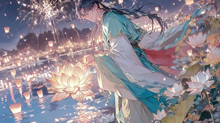 Midjourney Bot 更新时间:2025-12-14 00:00https://images.gogpt.vip/aigf/m_origin/20251213/617471/cvq6ecbcp5wopodh.png 一点点俯视角,一位优雅的年轻男子来自仙霞的奇幻场景,半身肖像,他在河边放莲花灯,站在岸上不在水里,浪漫,被春意包围, 张秋水(药师,男,弱受):体型苗条,比较精致,活泼俏皮。黑色长发,一部分系在发髻上,其余部分垂到腰部。刘海垂到胸前,头发轻轻飘动。宽松的3:7流苏勾勒出他的脸,蓝色的眼睛闪烁着淘气的光芒。优雅的中国传统服饰,青绿色和白色相结合的长袍,搭配红色腰带,袍子上装饰有精致的花纹和小挂饰,展现出古典的韵味,宽大的袖子和层叠的裙摆随风飘荡,象征着传统文化的美丽和气派,绿色和白色衣摆随风飘动,黑色的靴子在白色衣袍下若隐若现。他温文尔雅地笑着,手持发光莲花灯放入湖中,微俯身姿态,温柔亲昵。阴柔美,很像狡猾的小狐狸。 而不是侧面轮廓——脸至少有3/4可见, 背景:黑夜,夜晚元宵节氛围,湖面倒映暖色灯光,荷花灯随风漂浮,远处艺人打铁花火树银花闪烁,天空孔明灯点缀,湖边春花点缀,花草丰富但不遮挡人物。 二次元古风,精致脸庞,高细节,16k, 高分辨率,人体比例准确。 光影柔和暖色调,色彩干净亮丽,衣袍层叠飘动,仙气感和节日氛围强烈。 动作自然流畅,五官立体,发量饱满。 ultra detailed faces, refined facial features, extremely detailed eyes with blue-tone reflections, sharp yet soft jawlines, clean skin texture, premium bishounen beauty. Vivid colors, clear lines, high-end anime illustration, 16K quality.氛围:浪漫、春天般、温柔、亲密。 --ar 16:9 --stylize 589 --iw 0.25 --niji 6 --sref https://images.gogpt.vip/aigf/m_origin/20250104/617471/lgp61d20k2tf2ibq.jpg https://images.gogpt.vip/aigf/m_origin/20250101/617471/6n25uru3wyy07was.jpg https://images.gogpt.vip/aigf/m_origin/20241114/617471/qbdon7ja7ifldp2o.jpg https://images.gogpt.vip/aigf/m_origin/20241114/617471/80gnd5zmjz7m2ue4.jpg https://images.gogpt.vip/aigf/m_origin/20250618/617471/2bwu8505mozwnv4o.jpg --no female,side face,profile,messy hair,wrong color,low detail,ugly face,短发,女性,俯视以外的视角,不完整的身体,白天,白昼,白色背景,胸肌,没有高领口,水满过人的膝盖,女人,胸部,锁骨,躺,坐,same facial features,person in water,不是黑夜的背景,结构错误,身体畸形,白色的外袍,盔甲