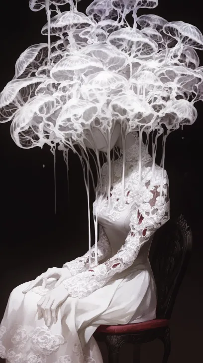 Midjourney Bot 更新时间:2025-12-14 00:01她的头颅是一枚磨砂质感的玻璃水母钟,软丝从钟沿垂落,;脖颈线条纤细白皙,皮肤是近乎瓷白的冷调,像覆着一层薄冰。 她穿着一件褪色的米白蕾丝衬裙,裙摆被不知名的露水浸得发沉,肩头搭着半件松垮的针织开衫,袖口磨出了毛边;手指关节泛着淡淡的粉,指尖捏着一支断了芯的白色蜡烛,蜡油顺着指缝往下淌,却没烫出半点痕迹。 --ar 9:16 --stylize 270 --niji 6 --profile p7396157204602028073