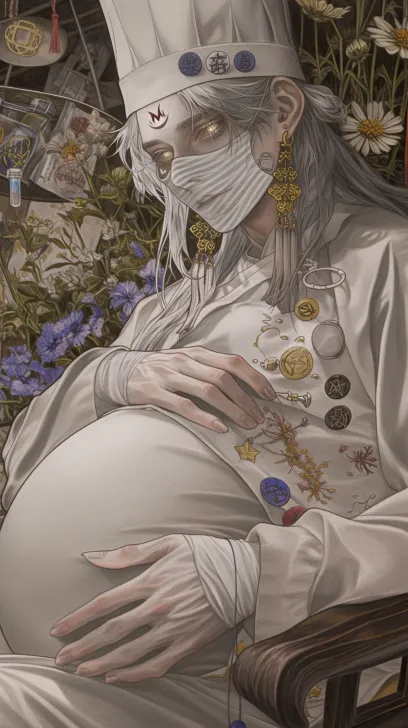 Midjourney Bot 更新时间:2025-12-14 00:01彩铅,一个怀孕俊美动漫男人,冷冽+刺绣帽子+厨师帽+野花+创可贴+汉服+灰白瞳+艳丽帅气+药房++琥珀系,厚涂插画,视觉系帅哥,银灰色长发、面衣、额头一个眼睛印记、长流苏金属耳坠,灰白条色虹膜、金瞳、银灰色细长睫毛、M型唇、手上魔法阵符纸咒文贴纸,makeup,手在肚子上,坐在椅子上, --ar 9:16 --style raw --stylize 180 --niji 6 --no no