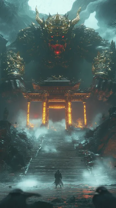 Midjourney Bot 更新时间:2025-12-14 00:02黑色神话:悟空风格,恶魔的气息弥漫,夜晚,极端低角度仰视大远景。巍峨南天门如巨峰矗立在云海之上,两尊巨型金甲天兵轰然降临,其身躯与交叉的战戟占满画面上部,投下的阴影吞噬了底部微小的喜鹊。艺术风格为强调规模与压迫感的史诗镜头。材质突出金属冰冷质感。光线为顶光与深影。古风玄幻风格,画面主要使用天青色和深红色风格,可怕的民间传说,全景拍摄,反应拍摄,风,色彩鲜艳,生动,高质量,超高,动态,(8k,原始照片),清晰的焦点,(疯狂的细节),高细节的照片,摄影现实主义,超现实主义,连续的角度,完美的构图,自然的几何形状,相机看着过去,闪闪发光的眼睛,昏昏欲睡的脸,模拟电影照片,薄雾和灰尘--第6.1节——第9:16节 --ar 9:16 --v 6.1 --stylize 100