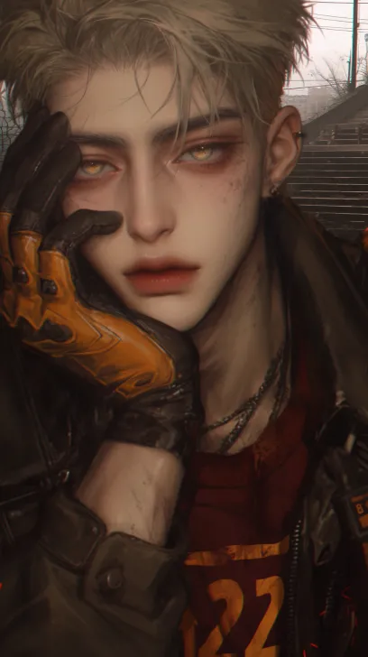 Midjourney Bot 更新时间:2025-12-14 00:00一个极其英俊的22岁男人,英俊,帅气,阴郁,长睫毛,浅色虹膜,一只手摸脸,手上戴着霹雳手套,黄色短发,内穿暗红色t恤,戴简单的项链,外穿黑色皮质制服,背景楼梯,废墟,清透,雾面,大胆的构图。精致的五官,老电影滤镜,8k壁纸,大师之作。 --ar 9:16 --c 2 --stylize 901 --niji 6 --profile r6ra4rs c22a1ma l1inms4 kxzxhy6 j5obhyk --no 露牙齿