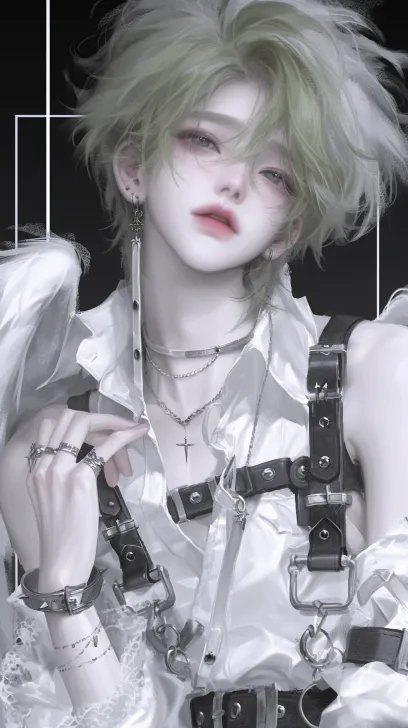 Midjourney Bot 更新时间:2025-12-14 00:03浅绿色头发、短发微卷、冷白肤色、泛红脸颊、精致五官、耳饰(耳坠)单手轻扯衣饰、身体微侧站立,银色亮面短裙、蕾丝荷叶边装饰、无袖设计、绑带元素、蕾丝腿环、金属扣件装饰,黑白撞色、简约边框、纯色暗底 --ar 9:16 --style raw --stylize 900 --niji 6 --profile z71sy35