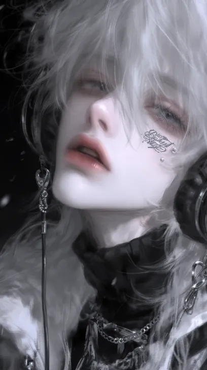 Midjourney Bot 更新时间:2025-12-14 00:01White hair, fluffy hairstyle, cool white skin tone, elongated eye shape, light-colored eyes, head slightly tilted, silver shiny coat, turtleneck inner layer, metal necklace (multi-layered), black over-ear headphones, metal bracelet, background is cool-toned dark color scheme, metallic hollow structure, snowing/falling white. --ar 9:16 --style raw --stylize 900 --niji 6 --profile zksgyr4