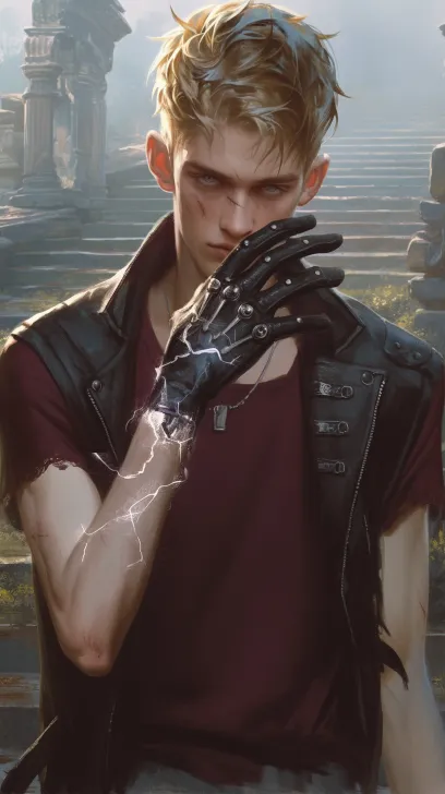 Midjourney Bot 更新时间:2025-12-14 00:03An extremely handsome 22-year-old man, handsome, gloomy, with long eyelashes, light colored irises, touching his face with one hand, wearing lightning gloves on his hand, short yellow hair, wearing a dark red t-shirt on the inside, wearing a simple necklace, wearing a black leather uniform on the outside, background stairs, ruins, clear, foggy, bold composition. Exquisite facial features, old movie filters, 8k wallpapers, masterpieces. --ar 9:16 --stylize 100 --niji 6 --no Show teeth.