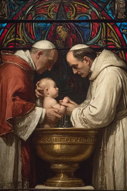 Midjourney Bot 更新时间:2025-12-13 00:29https://images.gogpt.vip/aigf/m_origin/20251212/1980289/qz9j82zxh8b7f9qd.jpg https://images.gogpt.vip/aigf/m_origin/20251212/1980289/291tf812w1kel23d.png https://images.gogpt.vip/aigf/m_origin/20251212/1980289/ghqeuz3e9et0xl0l.png https://images.gogpt.vip/aigf/m_origin/20251212/1980289/rkt4r7d00j311va8.png https://images.gogpt.vip/aigf/m_origin/20251212/1980289/r4pag9wmeiwvmjev.jpg https://images.gogpt.vip/aigf/m_origin/20251212/1980289/szybuupvknt3w6q1.png https://images.gogpt.vip/aigf/m_origin/20251212/1980289/a491r16nmi7qyi5e.jpg 画面最前端是三根点燃的蜡烛,左右两根比中间那根稍短。蜡烛后是金色受洗的盆(盆身刻有烫金拉丁文铭文,刻意做腐蚀处理:PATER NOSTER QUI ES IN INFERNO),盆中有受洗的婴儿(康妮的孩子),盆的左侧是身着白袍颈上披着红布条的神父,慈悲垂眉,念念有词(在念祷词),并用左手捧起水,正往婴儿的头上淋洒;盆的右侧是麦克·柯里昂(二代教父),他垂眉闭眼,神情肃穆,仿佛正在听神父的祷词。两个人的中间是教堂巨大的彩窗,彩窗呈头尖身正的形状,内部结构是上方一个复杂花纹的彩色圆玻璃,圆的下方是两个半圆弧的变形圆柱,左边那扇印着布道的耶稣,右边那扇印着跪倒在地的撒旦,然而撒旦虽然姿态低微,嘴角却噙着笑,眼神偷瞄着麦克·柯里昂,暗喻着麦克表面虔诚,实质已经成为恶魔。烟雾缭绕于整个空间,让整个画面富有神秘色彩、悲怆、庄严、肃穆,又隐隐令人不安。视觉冲突强烈的矛盾空间,细节丰富的拼贴层次,画面部分地方存在条形状的色块崩坏,给人以荒谬感,超现实氛围,8K高清 --ar 2:3 --v 7 --stylize 100 --iw 0.25