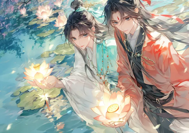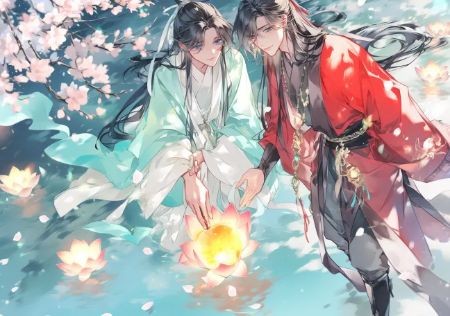 Midjourney Bot 更新时间:2025-12-13 00:34俯视角,两位优雅的年轻男子来自仙霞的奇幻场景,全身肖像,他们两人在河边放莲花灯,不在水里,浪漫而亲密,被春意包围。 张秋水(药师,男,弱受):体型稍小,比较精致,活泼俏皮。黑色长发,一部分系在发髻上,其余部分垂到腰部。刘海垂到胸前,头发轻轻飘动。宽松的3:7流苏勾勒出他的脸,蓝色的眼睛闪烁着淘气的光芒。优雅的中国传统服饰,青绿色和白色相结合的长袍,搭配红色腰带,袍子上装饰有精致的花纹和小挂饰,展现出古典的韵味,宽大的袖子和层叠的裙摆,象征着传统文化的美丽和气派,黑色的靴子在白色衣袍下若隐若现。他温文尔雅地笑着,手持发光莲花灯放入湖中,微俯身姿态,温柔亲昵。阴柔美,很像狡猾的小狐狸。 翔屿(将军,男,攻):红衣将军,身材高挑宽阔,风平浪静。长长的黑发用红丝带扎成高马尾,黑色长发,一部分系在发髻上,其余部分垂到腰部。宽松的3:7流苏勾勒出他的脸,刘海垂到胸前,头发轻轻飘动。灰色的眼睛,紧紧地盯着右边的男人的眼睛,表情深情。优雅的中国传统服饰,深红色和黑色的长袍,具有流畅的线条和金色的图案,腰间系有黑色带子,整体造型气质非凡。宽大的袖子和层叠的裙摆,象征着传统文化的美丽和气派,里面穿的黑色立领里衣,黑色的靴子在红色下装飘逸下若隐若现。一手扶灯,另一只胳膊紧紧地搂着右边男人的腰。表情严肃,英俊,更加成熟的气质,更加稳重的气质。 翔屿比张秋水高很多壮很多。 这两个角色都有直接的眼神交流,而不是侧面轮廓——两张脸至少有3/4可见,显示出亲密和亲密。 背景:黑夜,夜晚元宵节氛围,湖面倒映暖色灯光,荷花灯随风漂浮,远处艺人打铁花火树银花闪烁,天空孔明灯点缀,湖边春花点缀,花草丰富但不遮挡人物。 二次元古风,精致脸庞,高细节,16k, 高分辨率,人体比例准确。 光影柔和暖色调,色彩干净亮丽,衣袍层叠飘动,仙气感和节日氛围强烈。 动作自然流畅,五官立体,发量饱满。 ultra detailed faces, refined facial features, extremely detailed eyes with blue-tone reflections, sharp yet soft jawlines, clean skin texture, premium bishounen beauty. Vivid colors, clear lines, high-end anime illustration, 16K quality.氛围:浪漫、春天般、温柔、亲密。 --ar 297:210 --stylize 100 --niji 6 --sref https://images.gogpt.vip/aigf/m_origin/20250104/617471/lgp61d20k2tf2ibq.jpg https://images.gogpt.vip/aigf/m_origin/20250101/617471/6n25uru3wyy07was.jpg https://images.gogpt.vip/aigf/m_origin/20250808/617471/skrb4hllkycvq2ed.jpg https://images.gogpt.vip/aigf/m_origin/20251210/617471/l6sd697hx06b4bmg.jpg --no female,side face,profile,messy hair,wrong color,low detail,ugly face,短发,女性,俯视以外的视角,不完整的身体,白天,白昼,白色背景,胸肌,没有高领口,水满过人的膝盖,女人,胸部,锁骨,躺,坐,same facial features,person in water,不是黑夜的背景,结构错误,身体畸形,盔甲,勾肩搭背