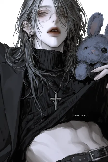 Midjourney Bot 更新时间:2025-12-13 00:39一个帅气的男人,CG质感好看,眼尾狭长,眼角微微上挑,眼角有一颗痣,斯文败类气,冷冽高冷,给人一种冰山美人的感觉,嘴唇唇色较淡,带着金丝半框眼镜,有金色镜链,男人年龄大约在25岁,帅气,站姿,微微倾胯,穿着黑色高领毛衣,一只手将毛衣下摆往上撩了一些,露出了腹肌,肌肉线条分明,有野性、性感,腹肌上有一点汗在流着。男人穿着黑色西装裤,有皮带,另一只手拿着一只可爱的蓝色兔子布偶,男人嘴巴微微向起,个头超高,耳朵上男人打了耳钉,其中一个耳钉是十字架型的,其他还带着一个十字架项链,他的眼膜是酒红色的。 --ar 2:3 --style raw --stylize 900 --niji 6 --profile p7396157204602028073