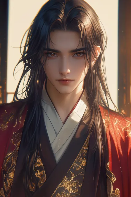 Midjourney Bot 更新时间:2025-12-13 00:40男性,古风,手绘笔触,伪厚涂,厚涂插画,非常成熟的面容,成年男性,优越的面部结构,黑色长发,棕色眼睛,穿着带有暗纹的暗红色古风长袖服饰,婚服,白色内衬,清冷气质,正对镜头,半写实风格,3D渲染,明亮色调,柔和光线,真实的皮肤纹理和质感,背景是古代木制屏风,复古感,,正对镜头,与观众眼神交流,牛仔镜头构图,正对镜头居中 --ar 2:3 --stylize 100 --niji 6