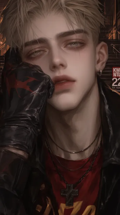Midjourney Bot 更新时间:2025-12-14 00:00一个极其英俊的22岁男人,英俊,帅气,阴郁,长睫毛,浅色虹膜,一只手摸脸,手上戴着霹雳手套,黄色短发,内穿暗红色t恤,戴简单的项链,外穿黑色皮质制服,背景楼梯,废墟,清透,雾面,大胆的构图。精致的五官,老电影滤镜,8k壁纸,大师之作。 --ar 9:16 --style raw --c 2 --stylize 901 --niji 6 --profile r6ra4rs c22a1ma l1inms4 kxzxhy6 j5obhyk --no 露牙齿