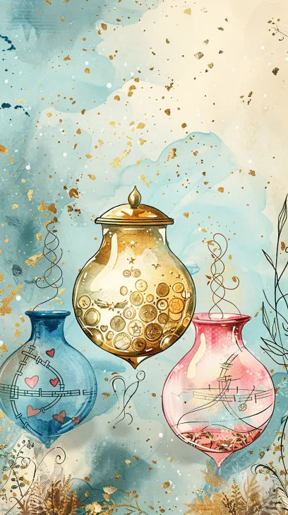 Midjourney Bot 更新时间:2025-12-12 00:09“为喜金水命理定制的炼金术主题壁纸。浅蓝与香槟黄水彩背景上,三只复古玻璃釜悬浮:金釜沸腾着硬币与星光,蓝釜蒸腾着草药蒸汽与符文,粉釜交融着双心与虹彩。釜身缠绕鎏金藤蔓,底部有魔法阵投影,金箔光点在背景闪烁。 --ar 9:16 --v 6.0 --style raw --stylize 250 --no photograph,realistic,3D”