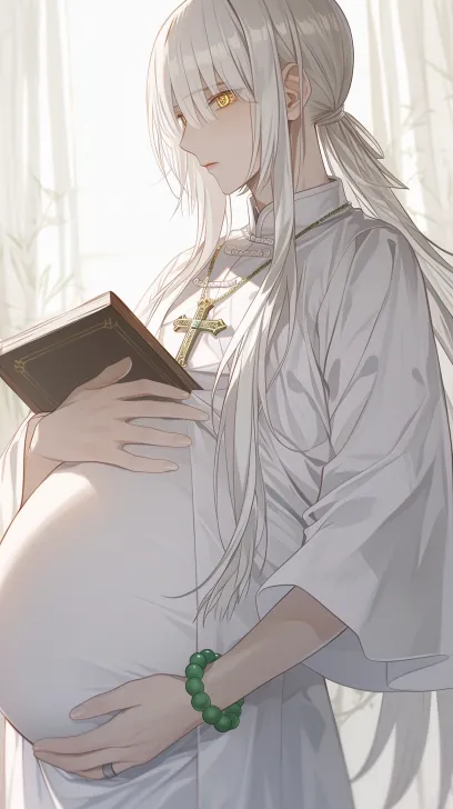 Midjourney Bot 更新时间:2025-12-12 00:10帅哥,怀孕,日漫风格,站着,白色长直发,低马尾发,两捋长刘海,金色眼睛,符号瞳孔,白色长睫毛,穿白色旗袍,拿着圣经,冷白皮,足够的亮度,绿色佛珠串珠手链。白天,采用Makoto Shinkai的风,动画美学,漫画风格元素。 --ar 9:16 --style raw --stylize 180 --niji 6 --no no