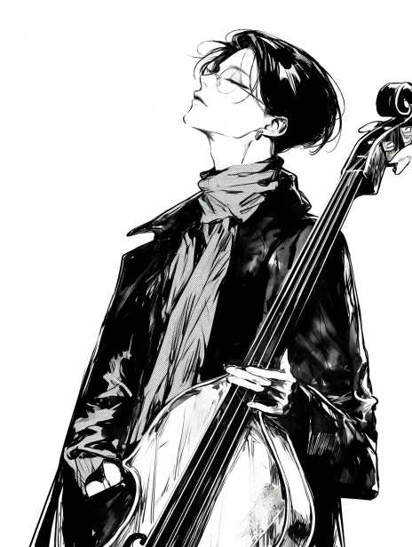 Midjourney Bot 更新时间:2025-12-13 00:18黑白韩国漫画,一名身穿黑色皮衣的黑色短发亚洲男子侧身站立,全身,戴着耳环,背着白色贝斯。 --ar 3:4 --c 5 --stylize 500 --niji 6 --profile htaouk1