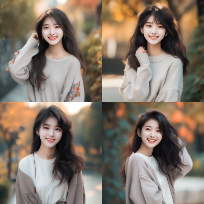 Midjourney Bot 更新时间:2023-09-04 13:56A 19-year-old Chinese girl wearing long sleeves, smiling, half length photo, with an outdoor background --ar 1:1 --niji 5