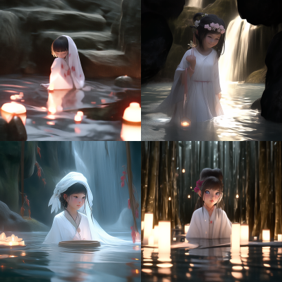 Midjourney Bot 更新时间:2023-09-04 13:58A 7-year-old Chinese girl in the water, 3D, c4d, wearing a white gauze Hanfu with shoulders exposed, close-up portrait, head portrait, natural hot spring pool, petals floating on the water, leaning against rocks, cinematic lighting, Chinese fairy tale, set against bamboo forest, Dingdal lighting, light points, highly detailed, dynamic, amazing, realistic lighting, and soft lighting, --quality 0.25 --ar 1:1 --style original --niji 5