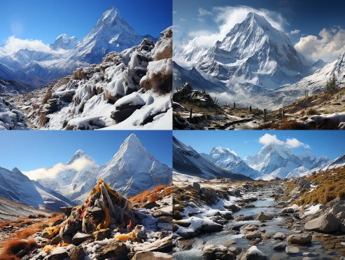 Midjourney Bot 更新时间:2023-09-04 14:07In this mysterious scene, we are taken into a realm that transcends reality. A silent silence covered the entire scene, as if time had stopped. In this world intertwined with death and life, we have discovered unique elements of Tibetan Buddhism.,The towering snow capped mountains perfectly connect the distant sky, shining pure white in the sunlight. Every mountain peak seems to be the embodiment of Buddha, emitting a refreshing and peaceful atmosphere. The falling snowflakes gently covered the ground, forming a soft, woolly white carpet.,In this minimalist context, a series of profound symbolic symbols have emerged. The ancient pagoda stands at the foot of the mountain, conveying a message of wisdom and peace to us. The mottled fragments of scriptures float in the air, as if they are memories of the past and inspirations for the future.,In this cosmic scene, we feel the impermanence of death and life. They are interdependent, like reflections in a mirror. This scene allows us to rethink the meaning of life and the essence of existence through the elements of Tibetan Buddhism. --ar 4:3 --style raw --v 5.2 --s 750