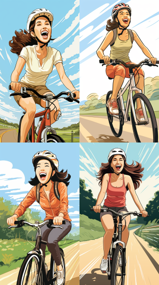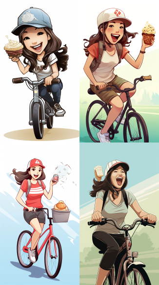 Midjourney Bot 更新时间:2023-09-04 14:04Illustration: A 30 year old woman, Asian, wearing a baseball cap, with a happy expression, eating ice cream, and riding a bicycle --ar 9:16 --style raw --v 5.2