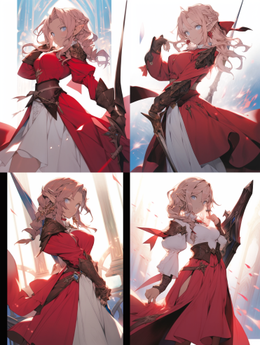 Midjourney Bot 更新时间:2023-09-04 13:56A high elf with red princess Vest and red fish tail skirt, Light pink Wavy hair, Ponytail, Blue eyes, Armed with a rapier,translucent cloak, Ethereal characters, Charming anime characters, With ethereal illustrations --ar 3:4 --style scenic --niji 5