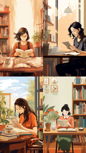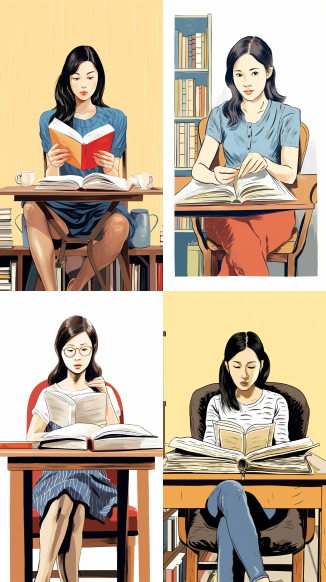 Midjourney Bot 更新时间:2023-09-04 13:49Illustration: A 30 year old woman, Asian, with a serious expression, sitting on a chair reading, with books on the table next to her --no characters --ar 9:16 --style raw --v 5.2