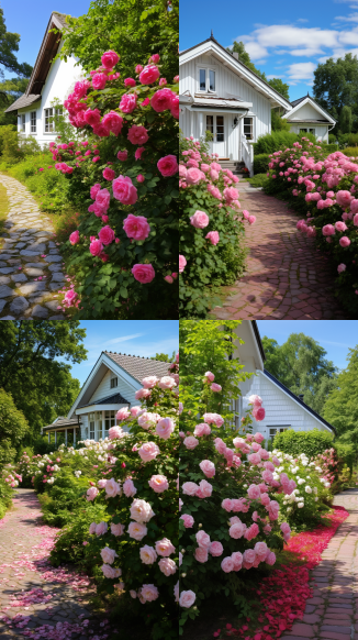 Midjourney Bot 更新时间:2023-09-04 13:55A corner of a Nordic style villa: There is a small road with roses planted on the roadside --ar 9:16 --style raw --v 5.2