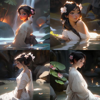 Midjourney Bot 更新时间:2023-09-04 13:53A 22 year old Chinese girl is in the water, 3D, c4d, wearing a shoulder off white gauze Hanfu, close-up portrait, head portrait, natural hot spring pool, floating petals on the water surface, leaning against rocks, cinematic lighting effects, Chinese mythological stories, with bamboo forests in the background, Dingdal lighting, light points, highly detailed, dynamic, stunning realistic lighting, soft lighting effects, - quality 0.25- ar 1:1- niji 5. --ar 1:1 --style expressive --niji 5