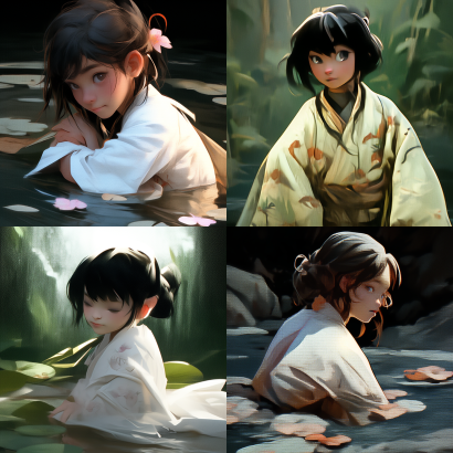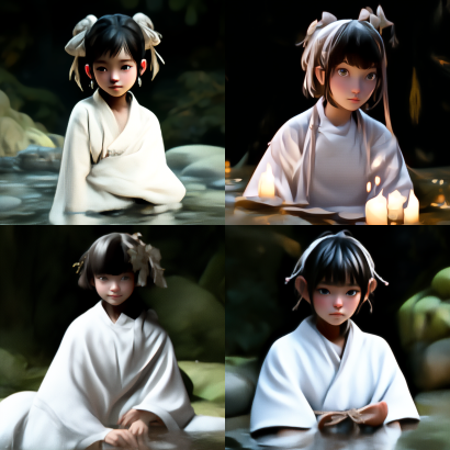 Midjourney Bot 更新时间:2023-09-04 13:51A 7-year-old Chinese girl in the water, 3D, c4d, wearing a white gauze Hanfu with shoulders exposed, close-up portrait, head portrait, natural hot spring pool, petals floating on the water, leaning against rocks, cinematic lighting, Chinese fairy tale, set against bamboo forest, Dingdal lighting, light points, highly detailed, dynamic, amazing, realistic lighting, and soft lighting, --quality 0.25 --ar 1:1 --style expressive --niji 5
