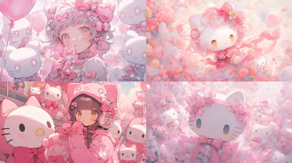 Midjourney Bot 更新时间:2023-09-04 13:45the picture is done in pink and white,Hello Kitty comes from Sanrio ,Hello Kitty girl,transparent colors,blink-and-you-miss-it detail,kawaii aesthetic, high-keyed palette,precisionist art ,Dream colors,low saturation ,Pastel,oil painting --ar 16:9 --niji 5