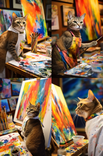 Midjourney Bot 更新时间:2023-09-04 13:52A cat wearing a painter's work uniform, holding a paintbrush, focuses on creating a colorful oil painting.,Spectacled cats wear color palettes and artist coats, skillfully depicting beautiful landscapes and images. --no Anime --ar 2:3 --style raw --v 5.2