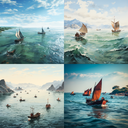 Midjourney Bot 更新时间:2023-09-04 13:40Fishing at sea, distance view, sea surface, old Chinese wooden boats, many boats --ar 1:1 --style raw --v 5.2 --s 250