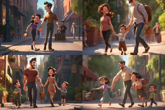 Midjourney Bot 更新时间:2023-09-04 13:28Reminder Workbench,Reminder Word Dictionary (3647),Young father, young mother, little boy The little boy is in the middle, and three people are walking hand in hand on the road, with trees on both sides The sunlight is shining on their faces, smoothing. Keeping the consistency of action, expression, clothing, shape, and appearance of the photos, 3D characters from Disney Pixar, super detail, blend, soft lighting, IP, blind box, mathematical edge lighting, romantic --iw 2 --ar 3:2 --style expressive --niji 5