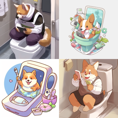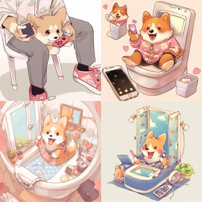 Midjourney Bot 更新时间:2023-09-04 13:37A little Corgi, sitting on the toilet, wearing clothes, playing with his phone. --weird 105 --s 216 --ar 1:1 --niji 5