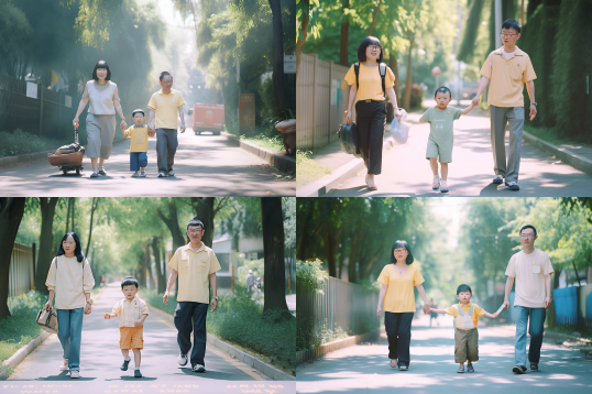 Midjourney Bot 更新时间:2023-09-04 13:34Young father, young mother, little boy The little boy is in the middle, and three people are walking hand in hand on the road, with trees on both sides The sunlight is shining on their faces, smoothing. Keeping the consistency of action, expression, clothing, shape, and appearance of the photos, 3D characters from Disney Pixar, super detail, blend, soft lighting, IP, blind box, mathematical edge lighting, romantic --ar 3:2 --style expressive --niji 5