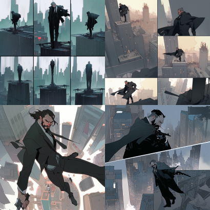Midjourney Bot 更新时间:2023-09-04 13:32In this image, we see a scene full of actions and adventures. The scene presents a protagonist similar to John Wick, dressed in a black suit and holding a shiny weapon, standing on the roof of a future city. The buildings in the city towered into the clouds, and through the glass windows one could see the brightly lit skyscrapers. Throughout the scene, comic like screen tones were used, adding a unique atmosphere to the image. The pattern and dot matrix effect of screen tones make the entire picture more vivid. Compared to traditional screen tones, this time larger and wider spaced dots were used, creating a more eye-catching and visually impactful effect. The quality of the image is very high, and every detail is meticulously drawn, giving people a sense of reality and surrealism. Overall, this is a creative and imaginative image that combines elements such as action, adventure, and future cities, giving people a sense of shock and excitement. --s 265 --ar 1:1 --style expressive --niji 5
