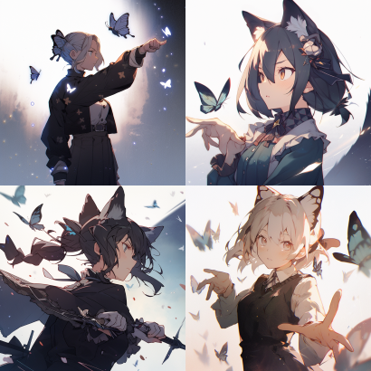 Midjourney Bot 更新时间:2023-09-04 13:39Butterfly personality, female, eleganthair and curves, hand on south, small, short hair, anime style, excluded expression, action with tension, werewolf, three quarters portlet --ar 1:1 --style scenic --niji 5