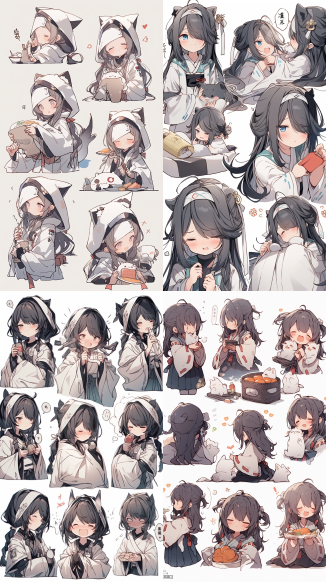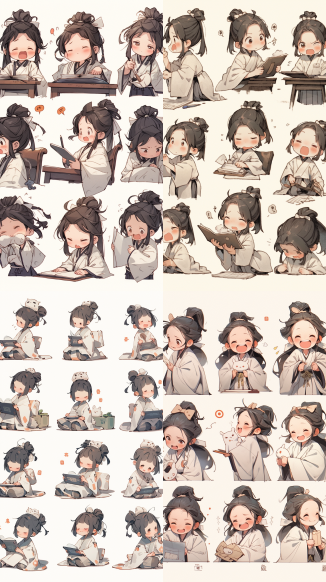 Midjourney Bot 更新时间:2023-09-04 13:03A little girl in a white robe reads, traditional clothes, animated character design, Chinese painting, light gray, cute, modest charm, emoticon package, 9 emoticons, emoticon Symbol table, multiple postures and expressions, anthropomorphic style, black strokes, different emotions, multiple poss and expressions, 8k --s 1000 --ar 9:16 --style original --niji 5